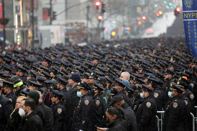 Miles de personas, la mayoría de ellas policías uniformados venidos de todo el país, se agolpaban frente a la Catedral de San Patricio y a lo largo de cerca de dos kilómetros en la 5ª Avenida de Manhattan, bajo el aguanieve persistente, preludio de la fuerte tormenta anunciada para este fin de semana, constató la AFP.