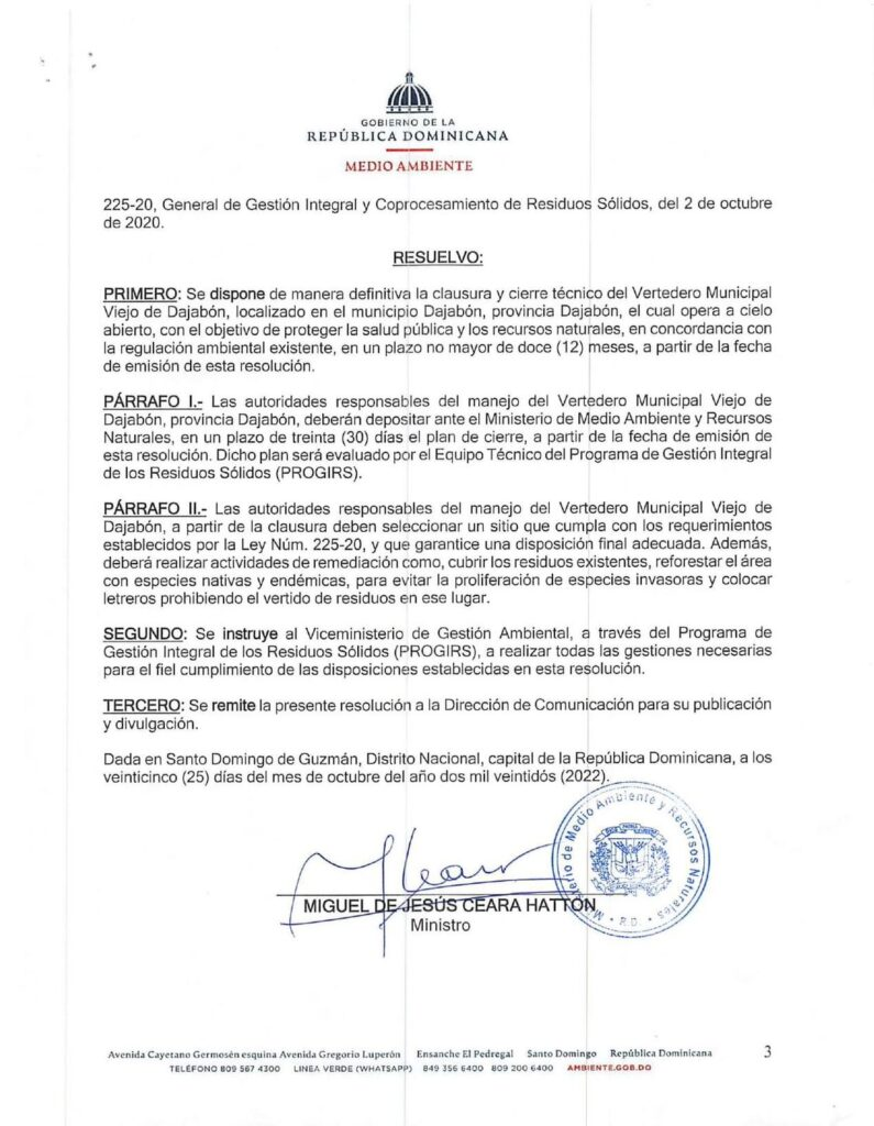 Mediante la resolución 044-2022, el ministro Miguel de Jesús Ceara Hatton, ordena a las autoridades municipales seleccionar un lugar que cumpla con los requerimientos establecidos por la Ley Núm. 225-20, y que garantice una disposición final adecuada; debido a que este vertedero a cielo abierto produce afecciones respiratorias en horas nocturnas cuando es encendido para quemar los desechos sólidos producidos por la ciudad.