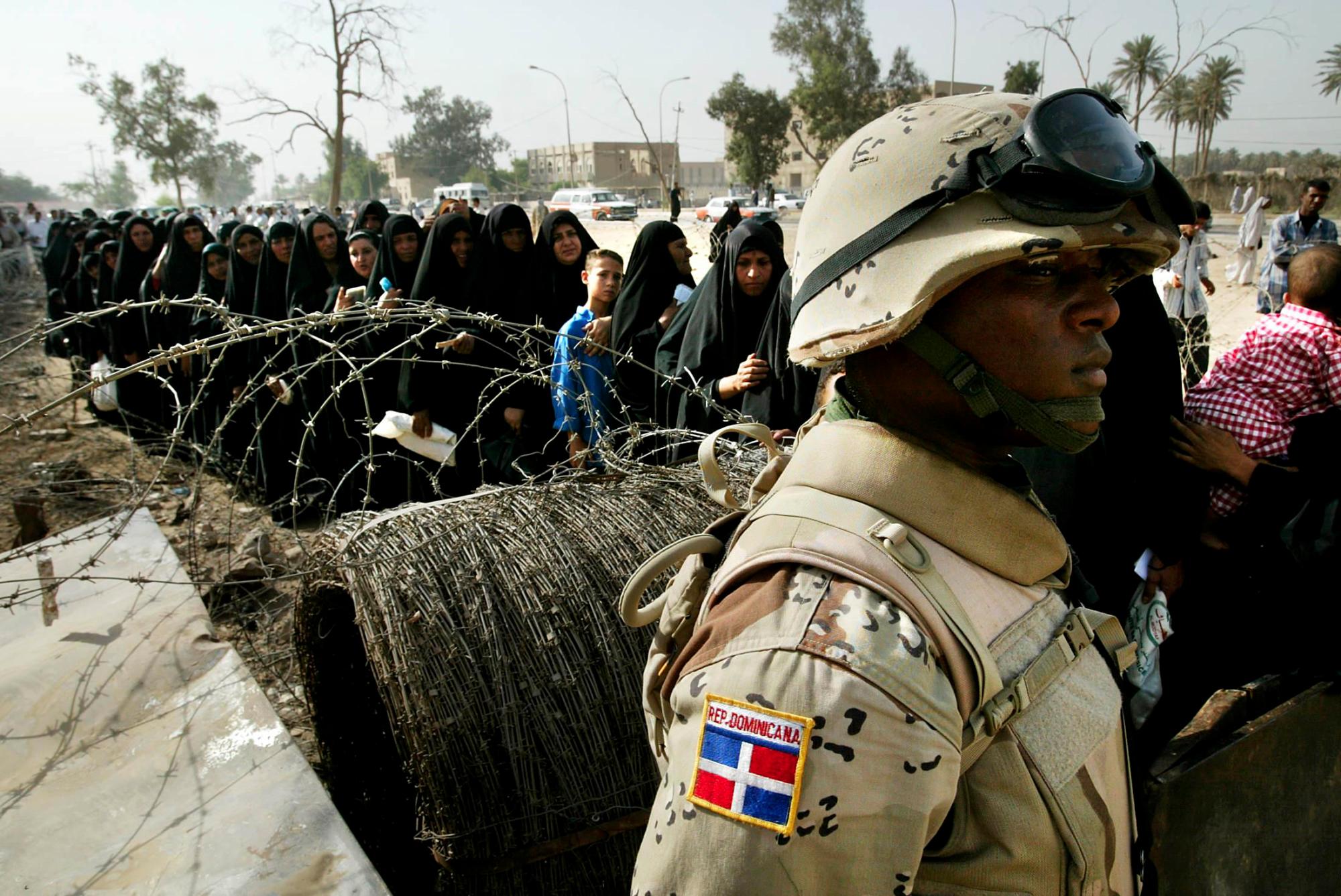 Soldados de la República Dominicana asisten a una ceremonia de despedida en la base de las fuerzas multinacionales en Diwaniya, el 1 de mayo de 2004. (FUERZA MULTINACIONAL/AFP)
