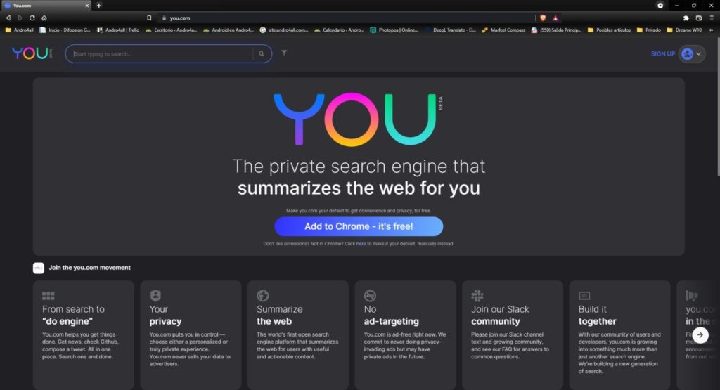 Para empezar a usar you.com simplemente tenemos que acceder a su web, pulsar en el botón Add to Chrome-It’s free e instalar su extensión en Google Chrome o en cualquier otro navegador que sea compatible con sus extensiones como Brave, Microsoft Edge, Opera o Vivaldi.